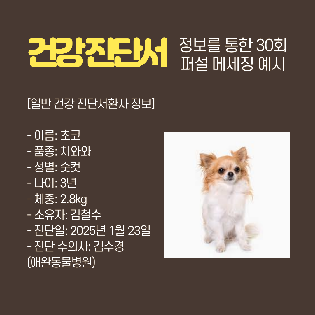 사랑하는 반려견 보호자들에게 정기적인 건강 정보를 제공하고, 병원의 단골 고객으로 만들 수 있는 기회! 보호자들이 메시지를 받으면, 자연스럽게 병원 방문을 고려하게 됩니다.