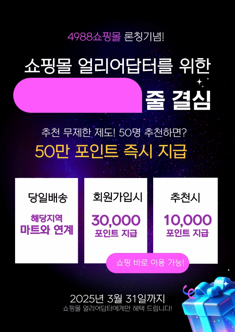 4월 론칭을 앞두고 4988에서 회원가입과 추천 활동 이벤트를 진행합니다. 회원가입만 해도 3만P 받고, 추천할 때마다 1만P 받을 수 있습니다. 포인트를 현금으로 출금도 가능해요! 많은 참여 부탁드려요~~~